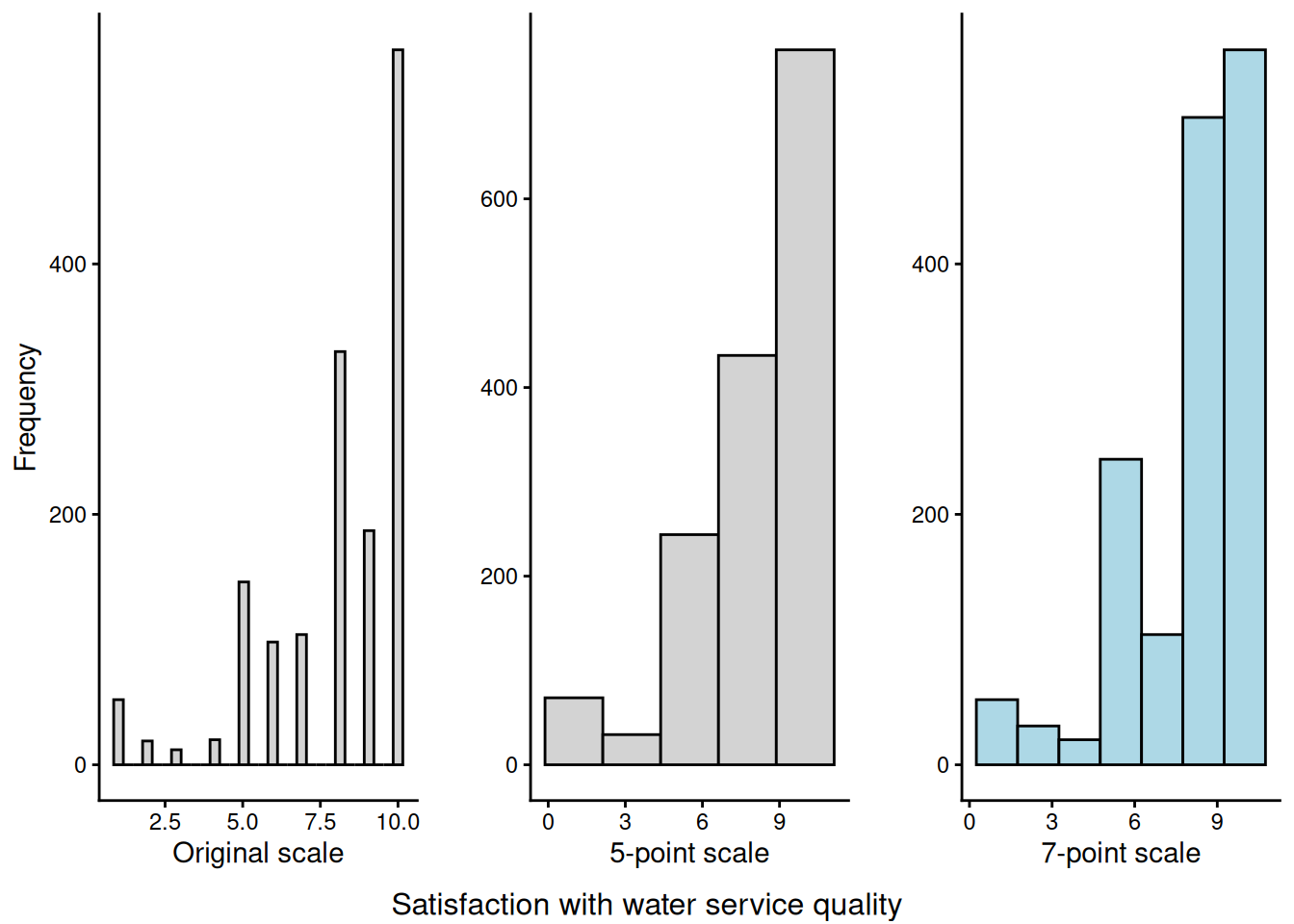 Data source: Así Estamos Juárez 2022 citizen perception survey (N=1,200+) Method: Visual histogram comparison using R and ggplot2 Analysis: For 10 public service satisfaction questions, I created three histogram versions: - Original 10-point scale - Simulated 5-point scale - Simulated 7-point scale