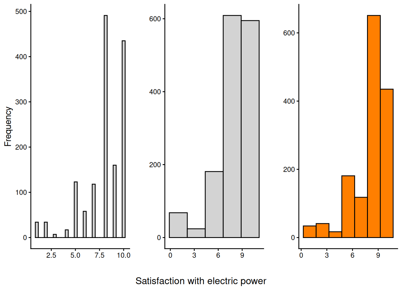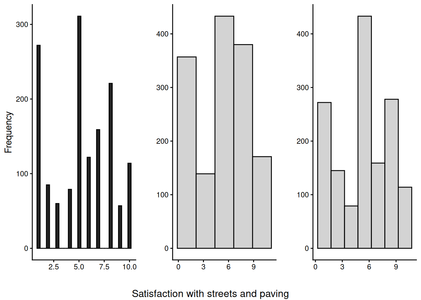 I analyzed whether a 10-point satisfaction scale in a civic survey could be reduced to 5 or 7 points without losing information quality. Using histogram comparison techniques on public service ratings from 1,200+ Ciudad Juárez residents, I identified which service questions could benefit from scale reduction and which required the full 10-point range.