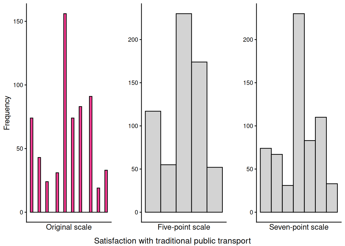 The analysis used the haven package to import SPSS data and ggplot2 for visualization. For each question, I created histograms using: - Original scale: geom_histogram() with default bins - 5-point scale: bins=5 parameter - 7-point scale: bins=7 parameter